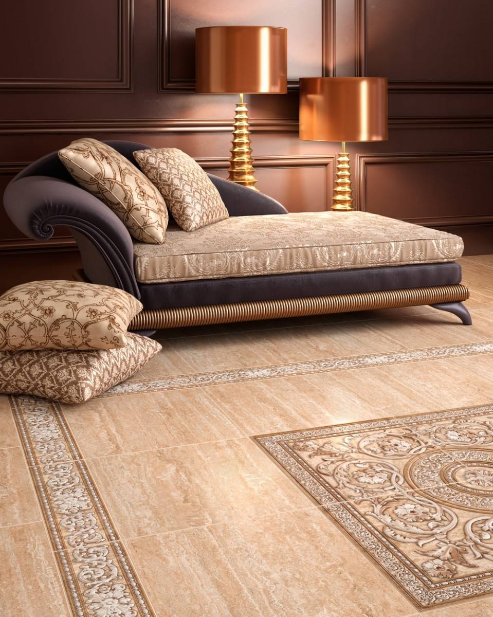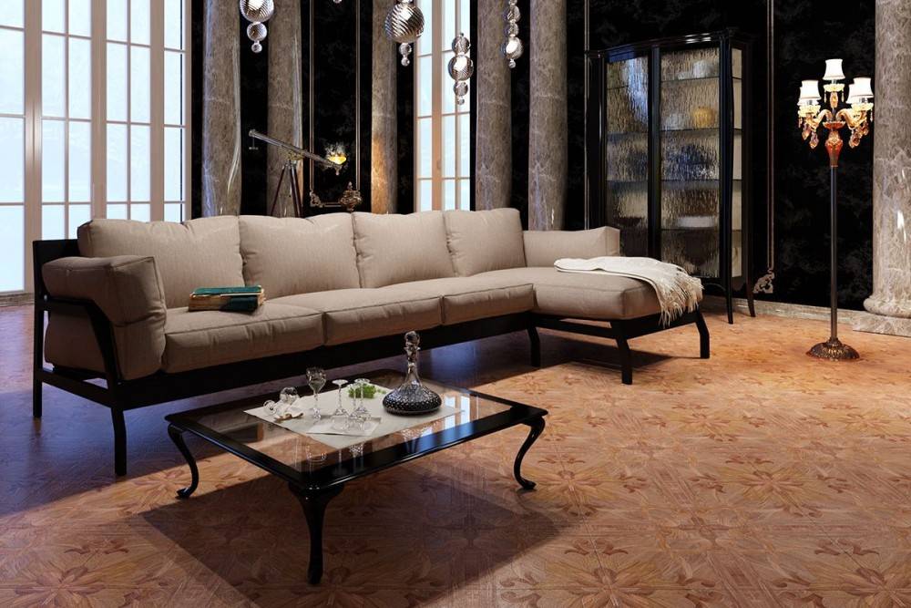 Реже керамогранит встречается в интерьерах гостиных, спален: в первую очередь ограничение по его применению обусловлены низкой температурой покрытия. Но если для современной гостиной есть материалы более подходящие, то в классической все же лучшим решением будет именно плиточный пол.