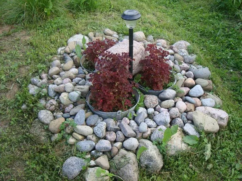 Рокарий, или каменистая горка, представляет собой группу живописно разбросанных на небольшом участке крупных камней разного размера, но одной породы (чаще всего, сланца или известняка). Это делается, чтобы имитировать горный луг. Крупные камни для клумбы вкапывают в землю в грунт для большей устойчивости, а рядом рассыпают мелкую гальку. На этом фоне идеально смотрятся низкорослые кустарники и стелющиеся растения (вереск, можжевельник, карликовая ель, туя, очиток, мискантус).