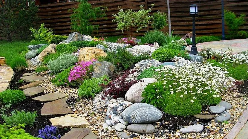 - Рокарий – комбинация растений и камней. Можно высаживать не только цветы, но и декоративные травы и невысокие кустарники.