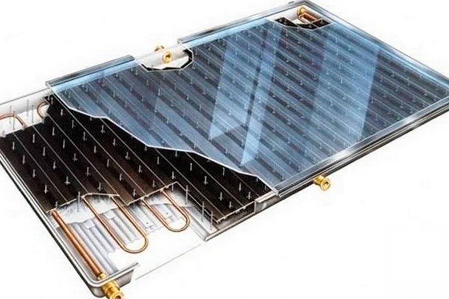 плоский. Внешне такой коллектор имеет вид прозрачной внешней панели. Внутри солнечной батареи такого типа размещаются трубки, а задняя часть оснащена теплоизолятором. Теплопотери здесь больше, однако конструкция легко собирается своими руками. Кроме того ее можно самостоятельно очищать от намерзшего снега и льда. Нагревает воду до 200 оС. К минусам следует отнести наличие большой нагрузки на фиксаторы устройства при сильном ветре, так как батарея имеет плохообтекаемую форму;
