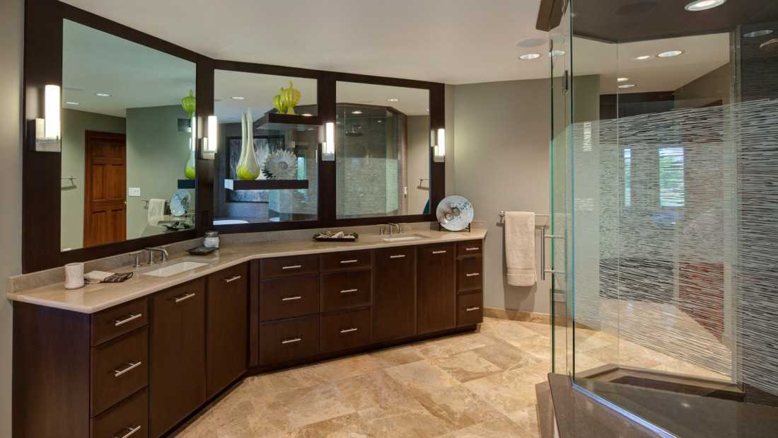 - При большой площади, установка двух угловых пеналов, между которыми расположены раковины, тоже является удачным решением.