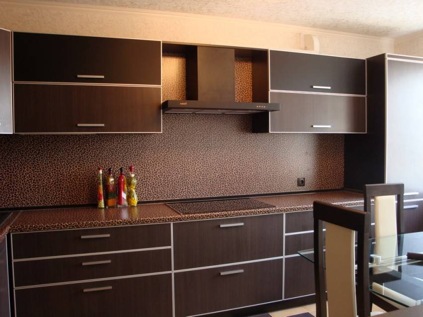 - В отделке фартука – практически в любом интерьере коричневая керамическая плитка, камень или дерево в фартуке будет отлично сочетаться со столешницей из того же материала или дерева. Но будьте осторожны с выбором слишком темных материалов, как уже было отмечено — они слишком маркие.