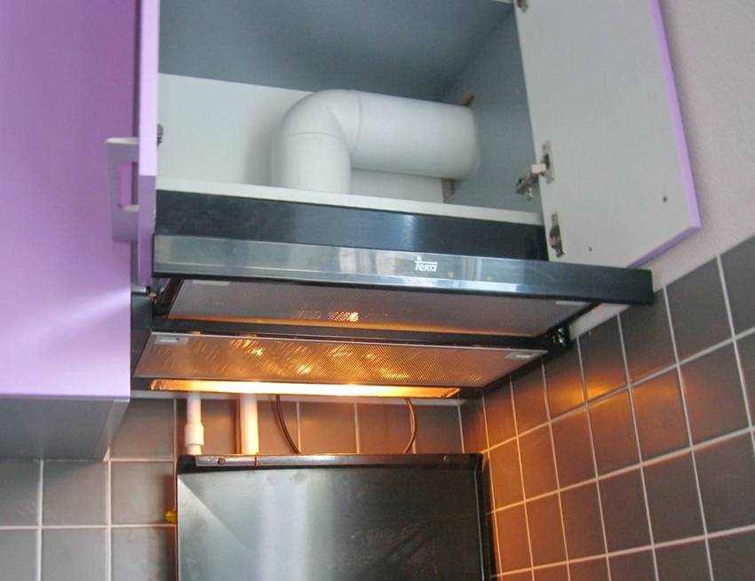 Пластиковый воздуховод смонтированный внутри кухонного шкафчика