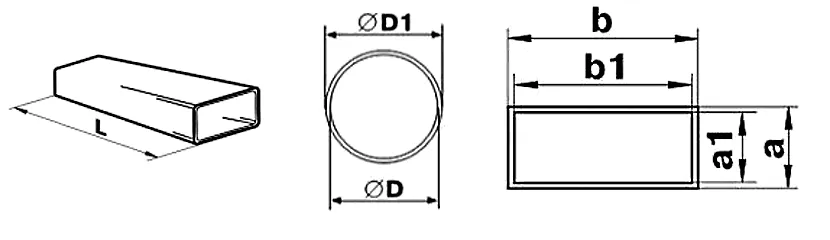 Диаметр, длина, ширина и высота элементов воздухоховода Источник blog-potolok.ru Дополнительные обозначения D1, b1, a1 указываются для отображения толщины стенок. Как правило, они составляют 3-5 мм.