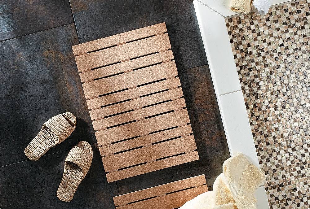 Такой коврик вы можете собрать из деревянных дощечек сами или купить готовый в хозяйственном магазине. Главный момент тут – верхнее пробковое покрытие, дающее те самые приятные тактильные ощущения: вставать босиком на такой коврик очень приятно! Воспользуйтесь листовой пробкой (её продают в строительных магазинах) или пробковой тканью. Нарежьте материал на полоски нужного размера и приклейте к деревянной основе.