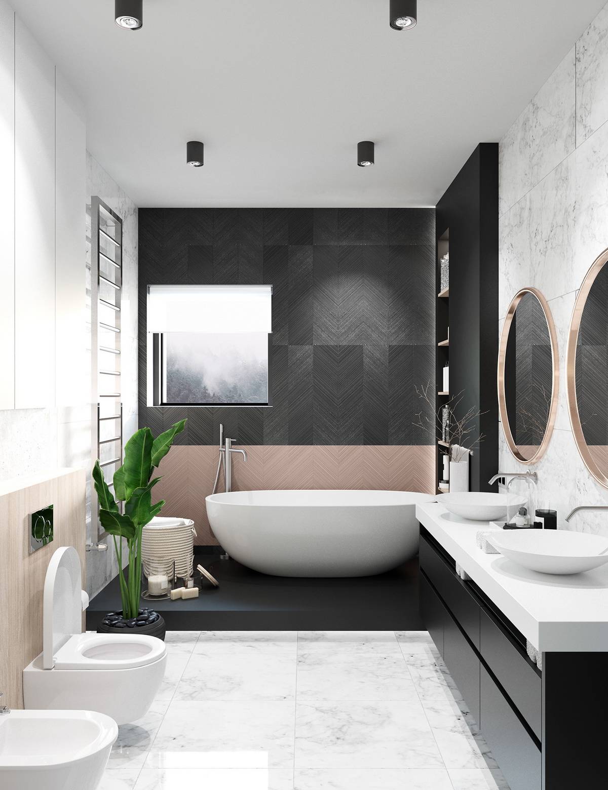 Сочетание черного и белого в ванной считается классическим решением, также идеально подойдет для минимализма. Добавление черного цвета оживит интерьер и сможет сделать его уютным. Беспроигрышный вариант — сочетание белого (преобладающего) и черного (небольшие вставки).