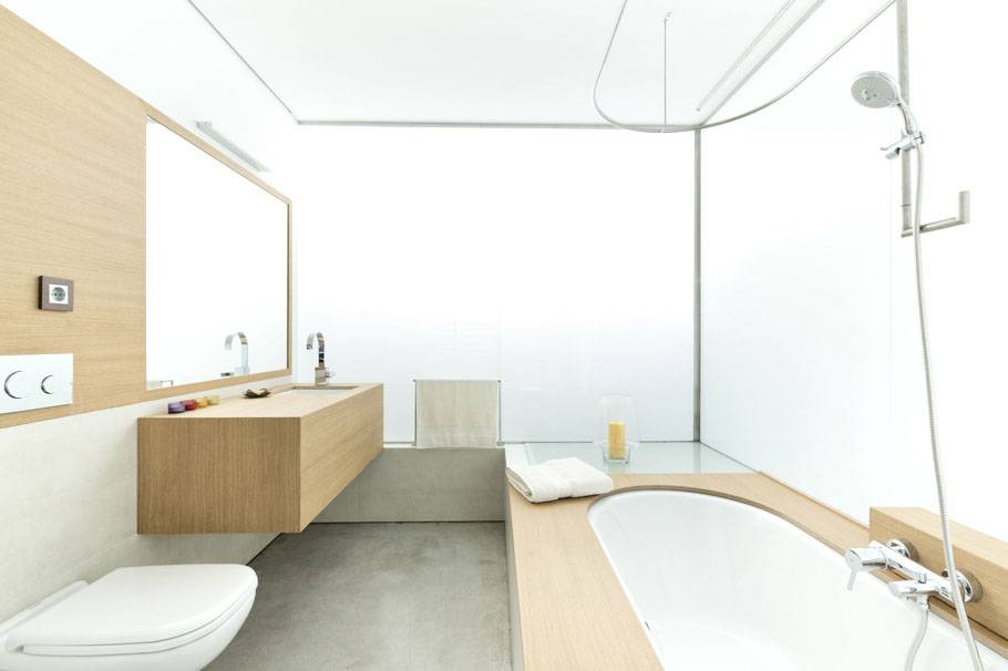 Минималистский дизайн ванной комнаты с белыми стенами и элементами из светлого дерева придаёт ей вид спа-салона