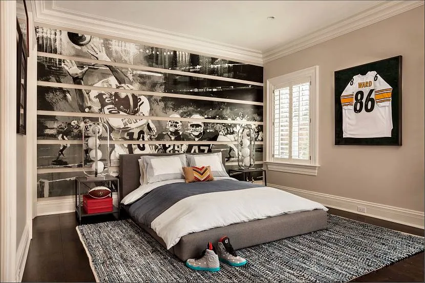 Внимание Дизайн спальни для одного или нескольких мальчиков должен отображать детские интересы, увлечения. Например, юный футболист однозначно будет рад проводить всё своё свободное время в комнате, выкрашенной в цвета флага любимой футбольной команды. Если же такой пока нет, можно ограничиться бело-чёрной гаммой, разбавленной травяным и тёмно-синим колером