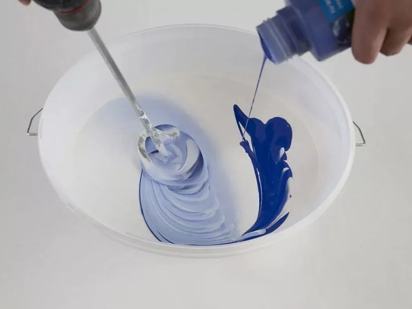 Если традиционные расцветки не пришлись по душе, рекомендуется обратиться к колеровке. Перемешивать составы требуется специальной дрелью, чтобы впоследствии цвет потолка получился равномерным.