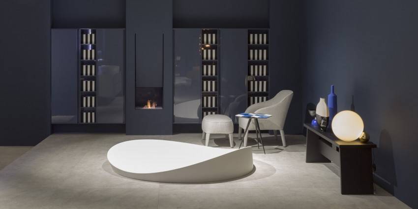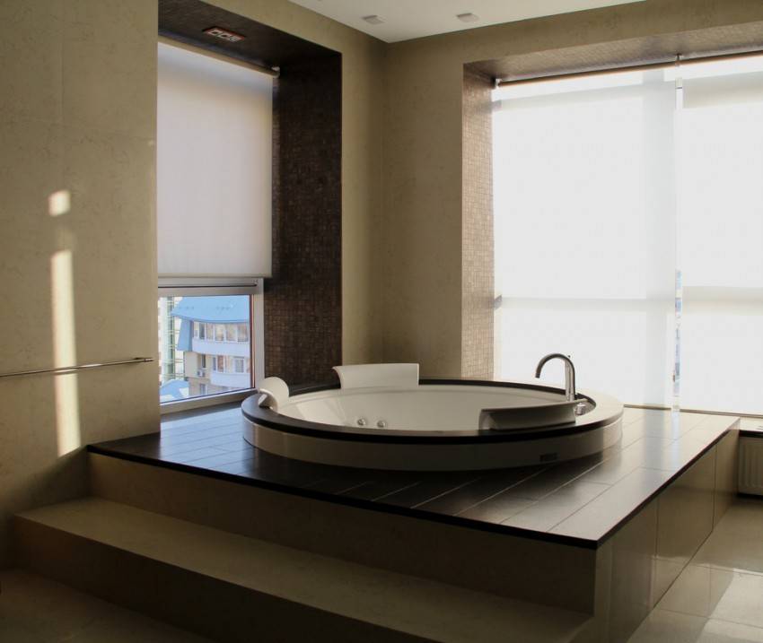 В просторном помещении роскошно выглядит ванная-подиум, ванна овальной или круглой формы, отдельно стоящая конструкция из камня или чугуна;