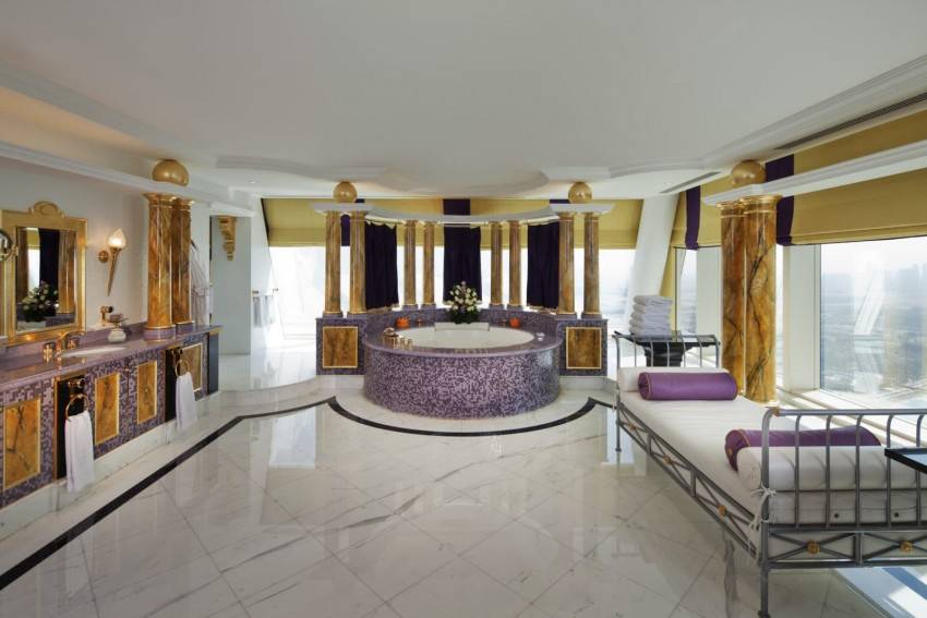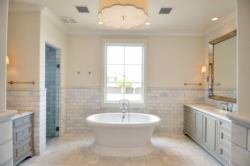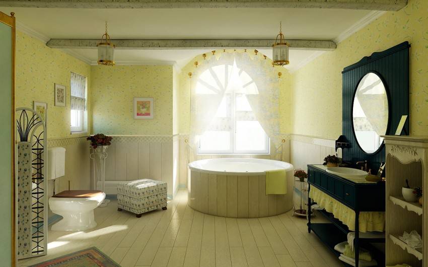 Особое внимание стоит уделить угловой ванне на подиуме: в классическом стиле такая конструкция смотрится величественно и монументально. Поскольку ромбовидный или полукруглый подиум требует много свободной площади, помещение должно быть просторным