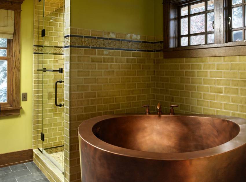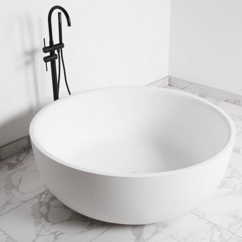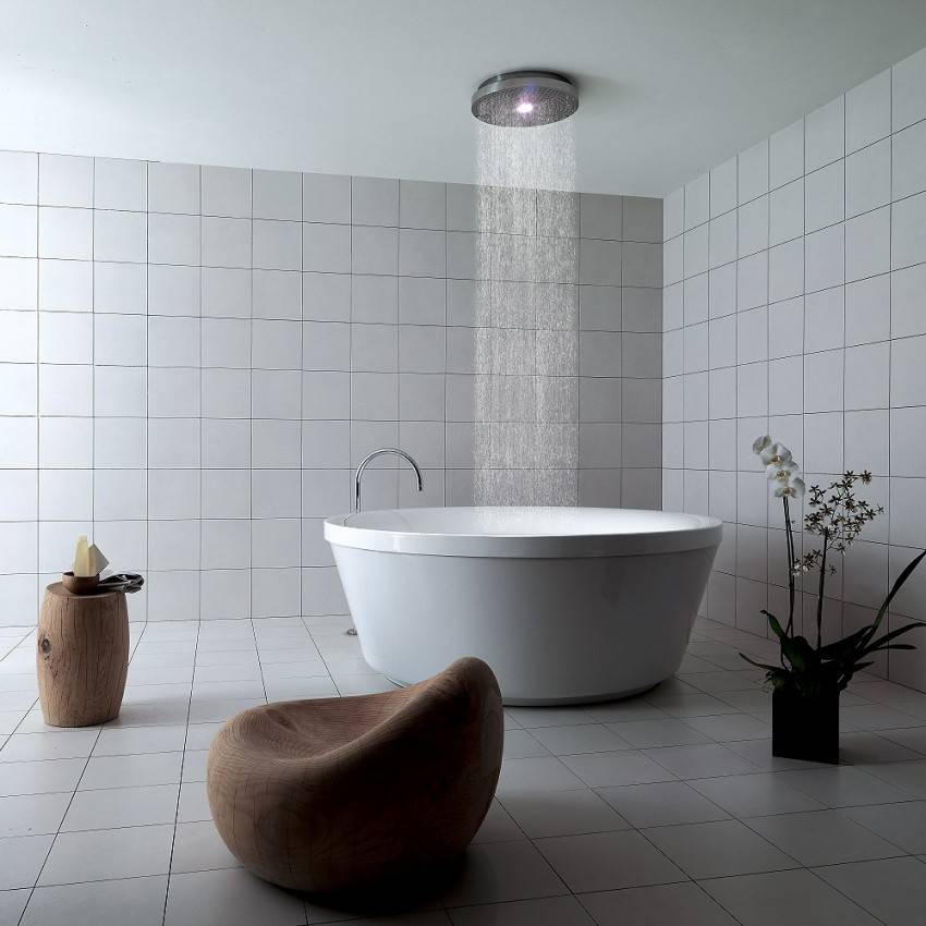 Круглая ванная в интерьере – это увеличение расхода воды, важно это учитывать. Душем тоже можно будет пользоваться и за счёт этого сократить расход