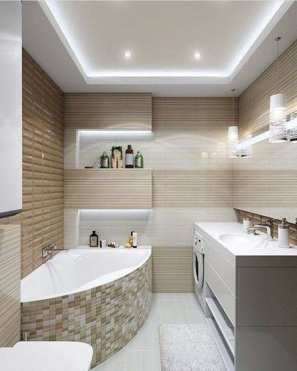 Такая идея планировки максимально использует маленькое помещение ванной комнаты, которое становится прекрасной угловой ванной 2 в 1. Современный дизайн, совмещенный с душевой кабиной или раковиной, оставляет достаточно места, чтобы все элементы могли поместиться в небольшом пространстве.