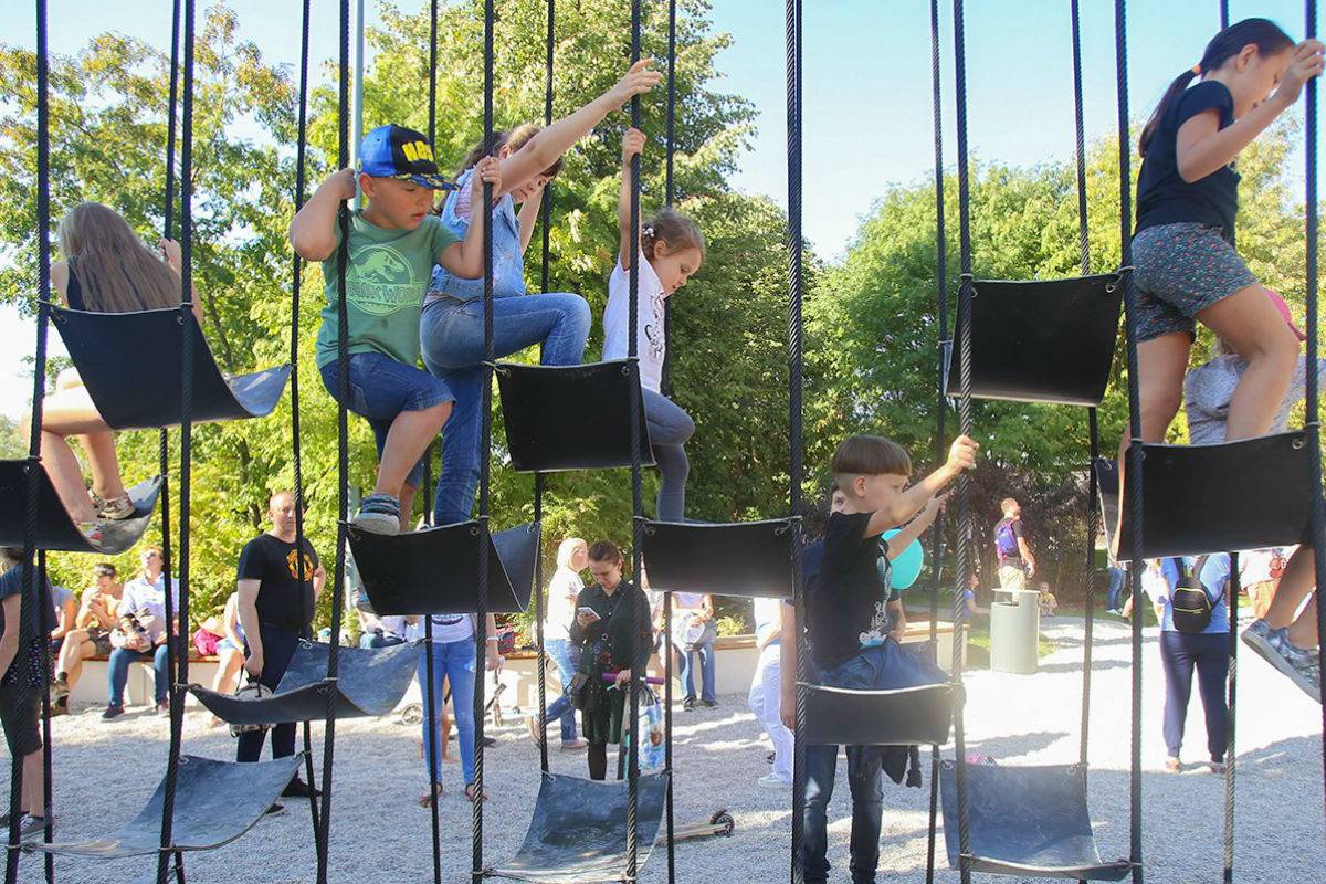 На площадке установлен не имеющий аналогов в мире комплекс «Мегакачели» – это 29 разнообразных качелей как для детей, так и для взрослых. Среди развлечений также: «Водная станция» – 100 метров каналов с дамбами и плотинами, винтами Архимеда и водяными пулеметами, игровой комплекс «Башни», с которого открывается живописная панорама на Парк Горького, зона «Овраг» с горками и скалодромом, а также песчаный комплекс «Морское дно», где дети могут поиграть с сухим и мокрым песком и даже откопать скелет динозавра.