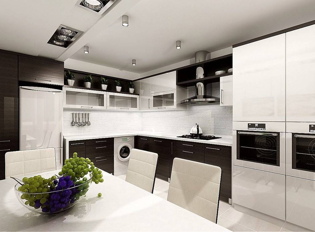 Контрастная кухня в настоящее время находится на пике популярности, однако с течением времени может не только надоесть, но и начать раздражать. Чтобы этого избежать, лучше всего выбрать пол и мебель более спокойных цветов, а на контрасте подобрать цвет обоев или штор.