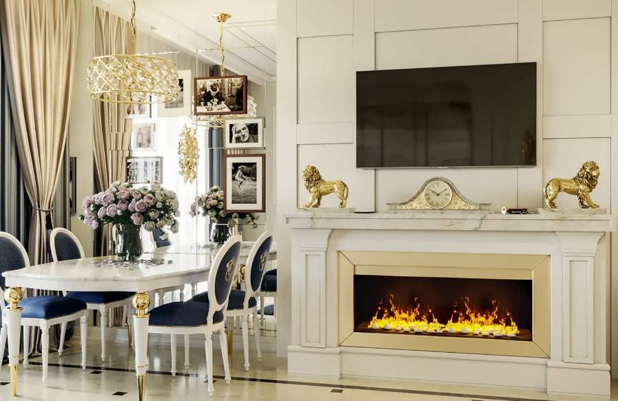 - Помещение в стиле неоклассика дополнит современный электрокамин с золотистой декоративной решеткой.