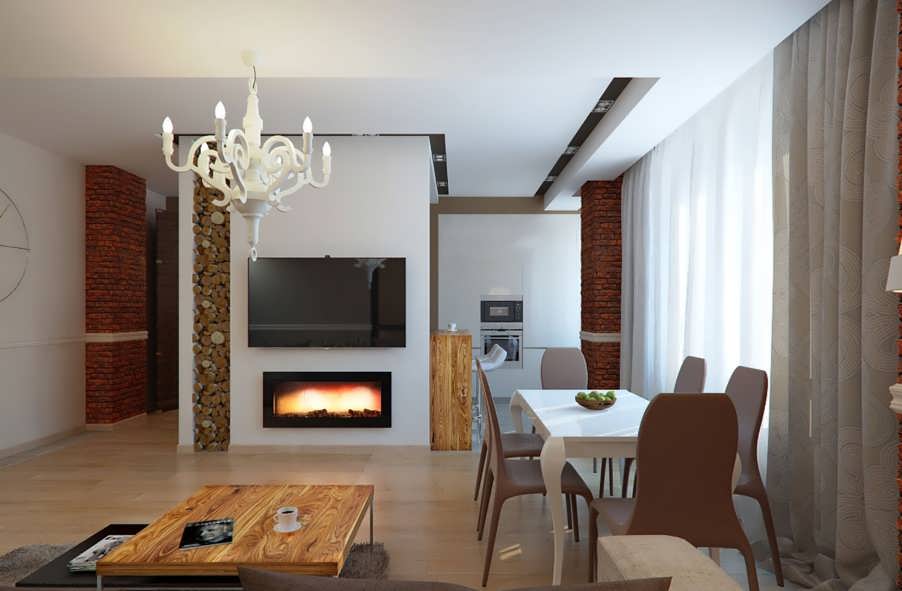 Площадь помещения – один из основных факторов выбора места установки каминной печи. Дизайн гостиной с камином и кухней демонстрируют фото: