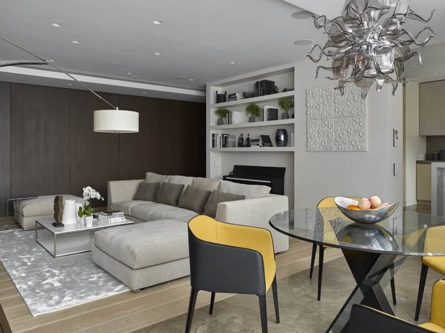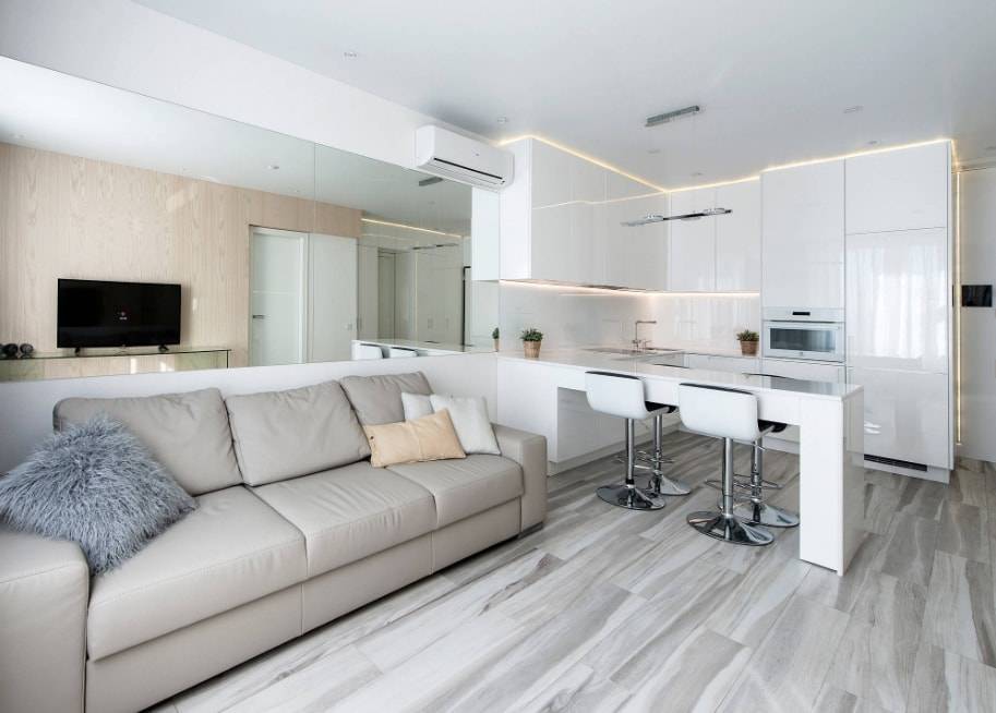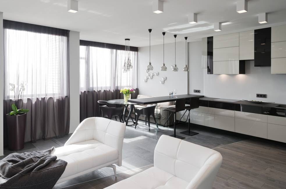Лаконичный дизайн кухни-гостиной подойдет современным людям, которые любят минимализм во всем.