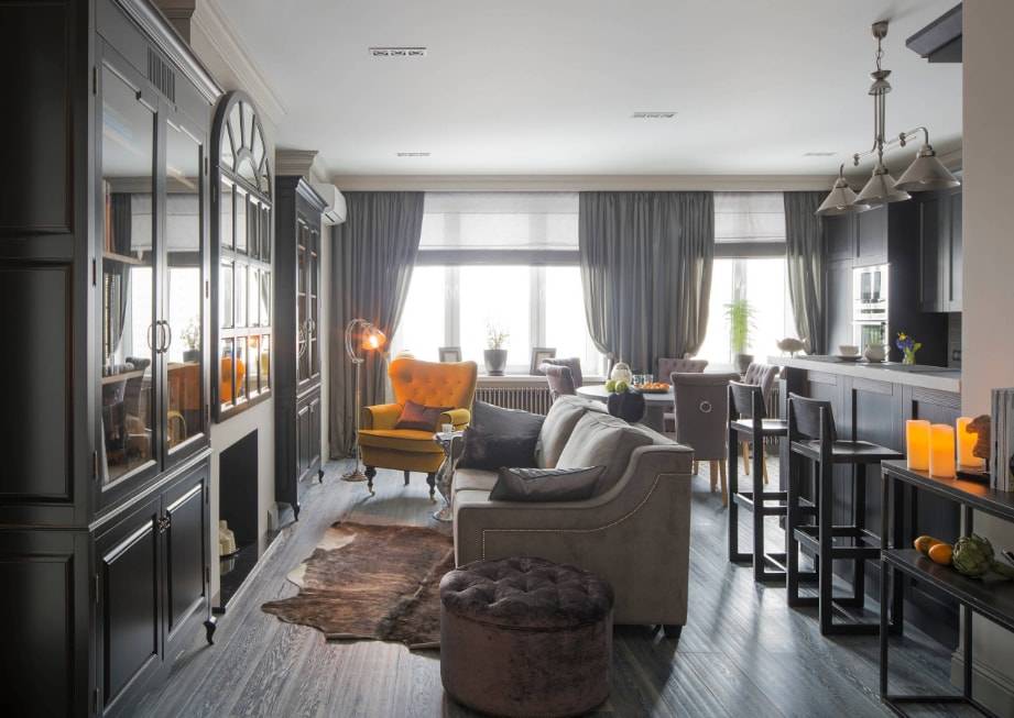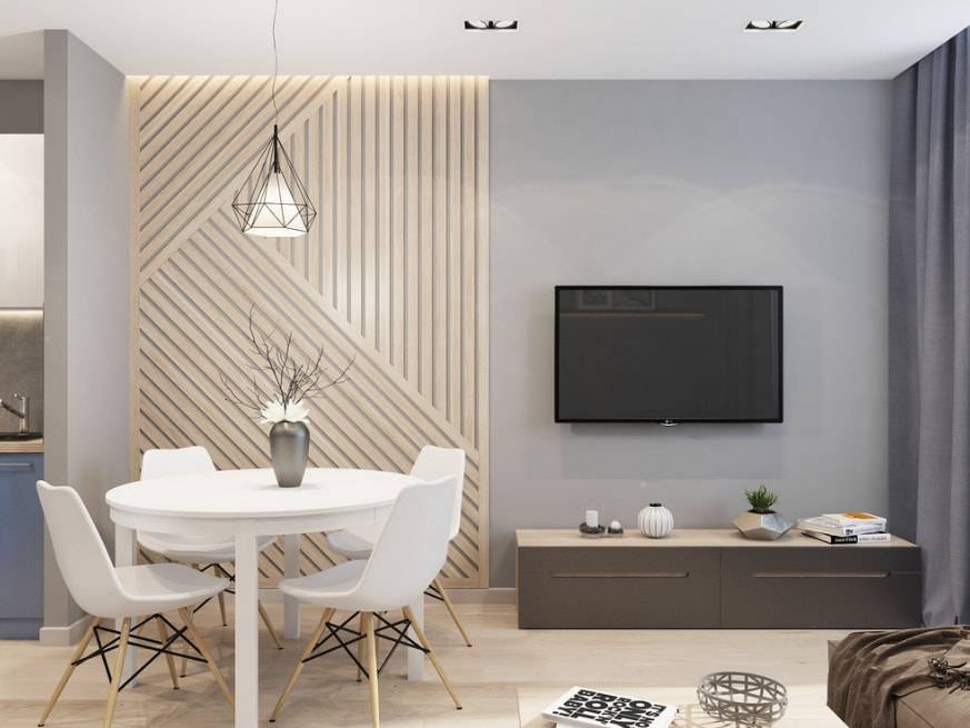 Другой вариант – выбрать 2-3 основных цвета и повторить их по всему пространству гостиной-кухни или квартиры-студии. Такие решения будут сглаживать резкий переход между зонами в пространстве.