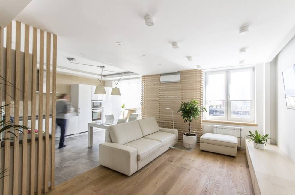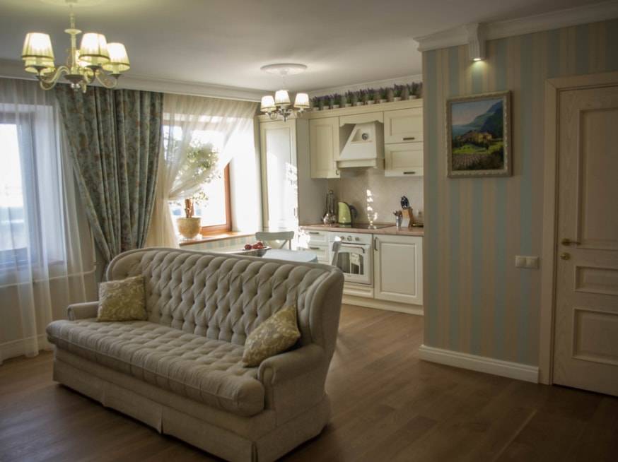 Если у вас студия, то остается лишь создать комфорт и обеспечить функциональность в зоне кухни-гостиной. Рекомендуем использовать натуральные материалы в теплых тонах.