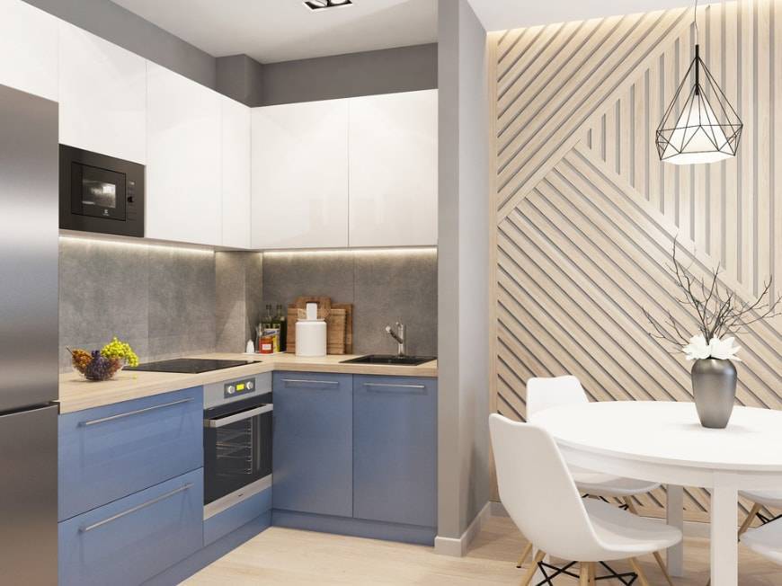 - Чтобы обстановка не выглядела монотонной, ее разнообразят вкраплениями ярких цветов — обивкой мебели, коллекцией чашек, контрастной столешницей. Плохое решение для маленькой комнаты — цветной потолок, уменьшающее ее высоту.