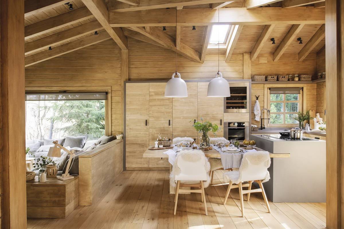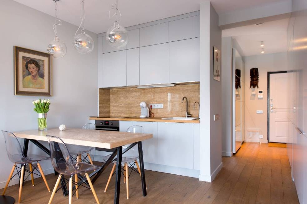 Таким образом можно даже зрительно увеличить пространство. Также очень часто чтобы дополнить такой интерьер, используют освещение над обеденным столом.