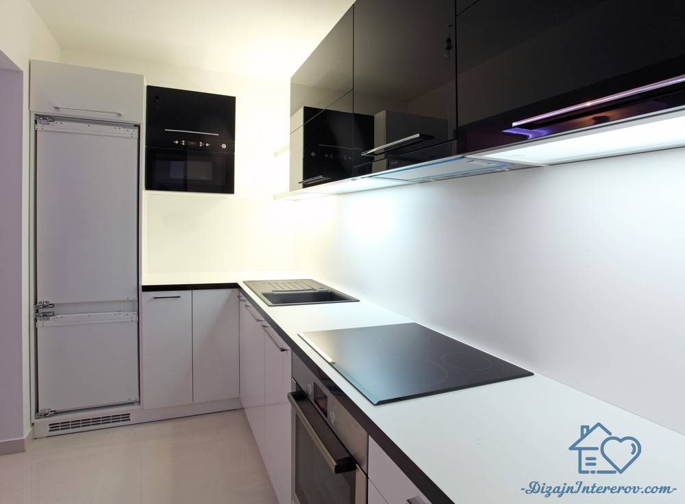В интерьере узкой кухне не возбраняется применять сочные теплые, а также черные цвета