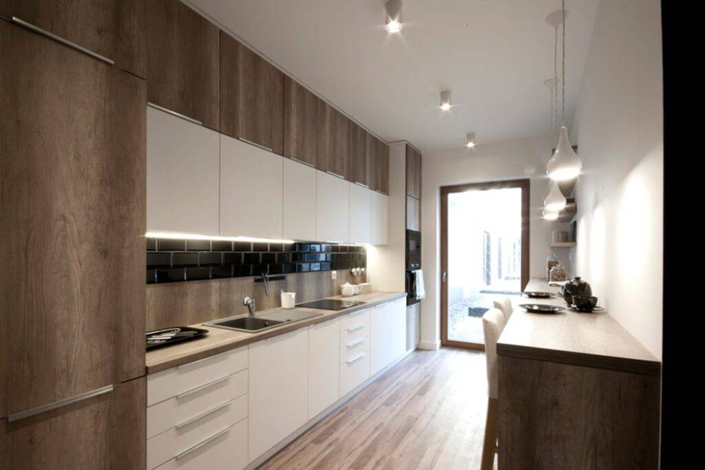 Довольно сложно подобрать для узкого длинного помещения готовый комплект, который бы подошел идеально. Обладателям кухонь нестандартных размеров лучше всего изготавливать мебель персонально, учитывая все особенности помещения, бытовой техники и цветового решения.