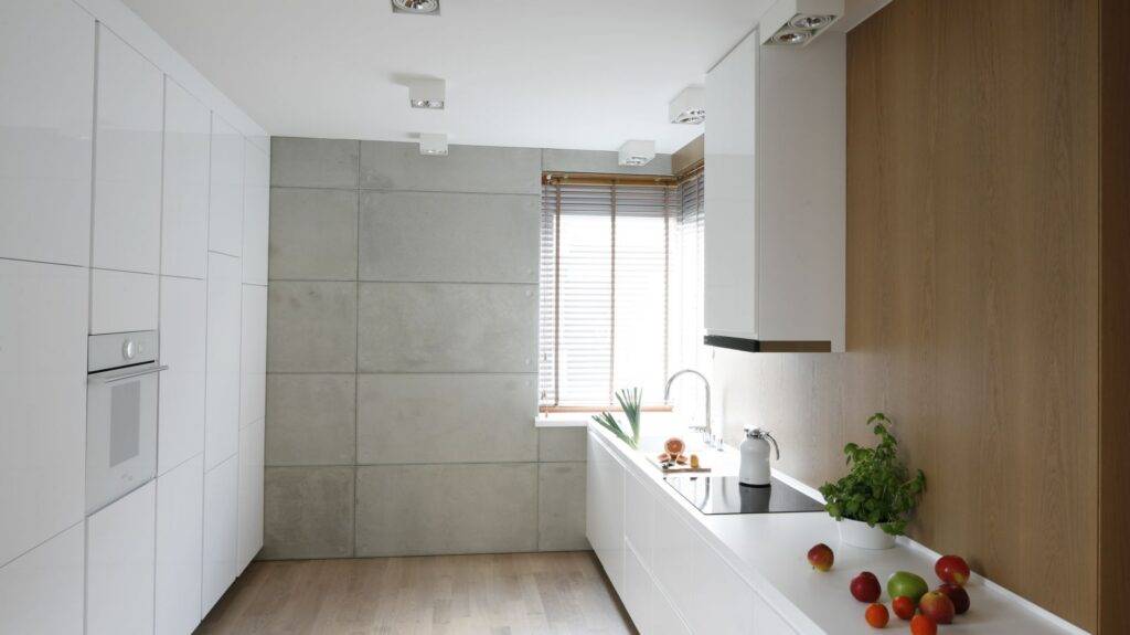 - Не стоит заставлять пространство большим количеством шкафов и навесных полок, на узкой кухне это будет выглядеть неуместно.