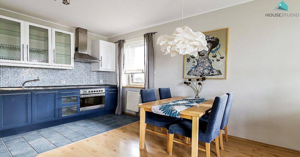 Классика – здесь синий может присутствовать в шторах и скатерти, а вот гарнитур лучше выбрать из дерева. Синими в такой кухне могут быть декоративные элементы и люстра.