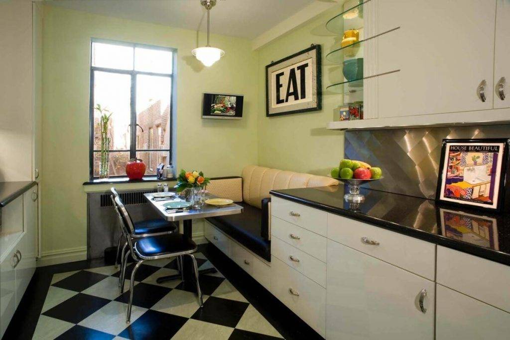 Компактный диван вдоль стены. Если стол расположен при входе в кухню, то его можно дополнить узким диваном, расположенным вдоль стены. Но, скорее всего, диванчик и стол займут все свободное место, и до противоположной стены можно будет дотянуться рукой. Помните об этом, рисуя планировку.