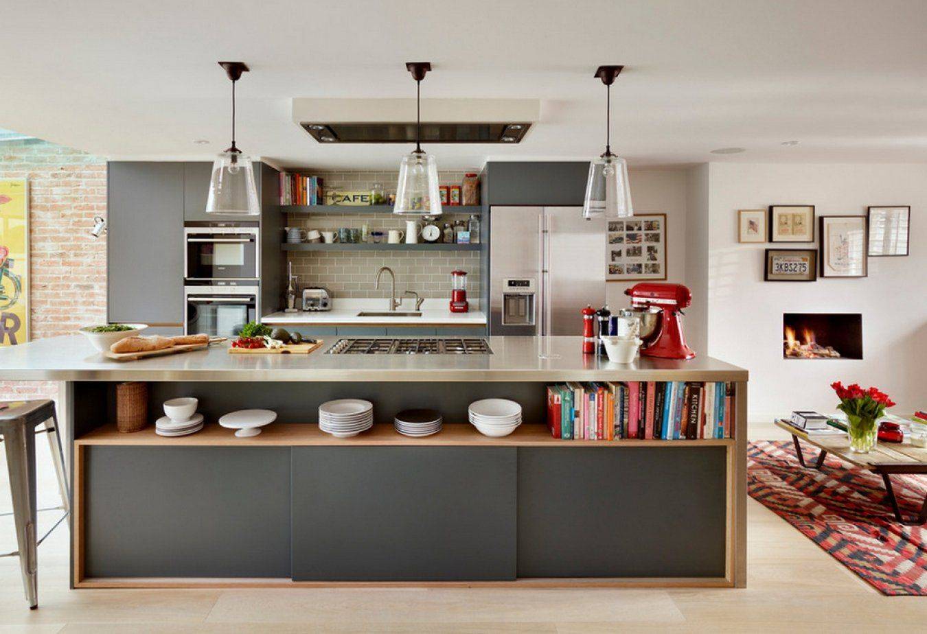 Остров на кухне-гостиной становится частью зонирования. Можно использовать натуральные материалы, которые выгодно смотрятся на большой площади. Также над островной конструкцией размещают подвесные полки для хранения посуды или кухонных принадлежностей. Стильно смотрятся светильники на длинных проводах во всю длину или несколько одинаковых плафонов.