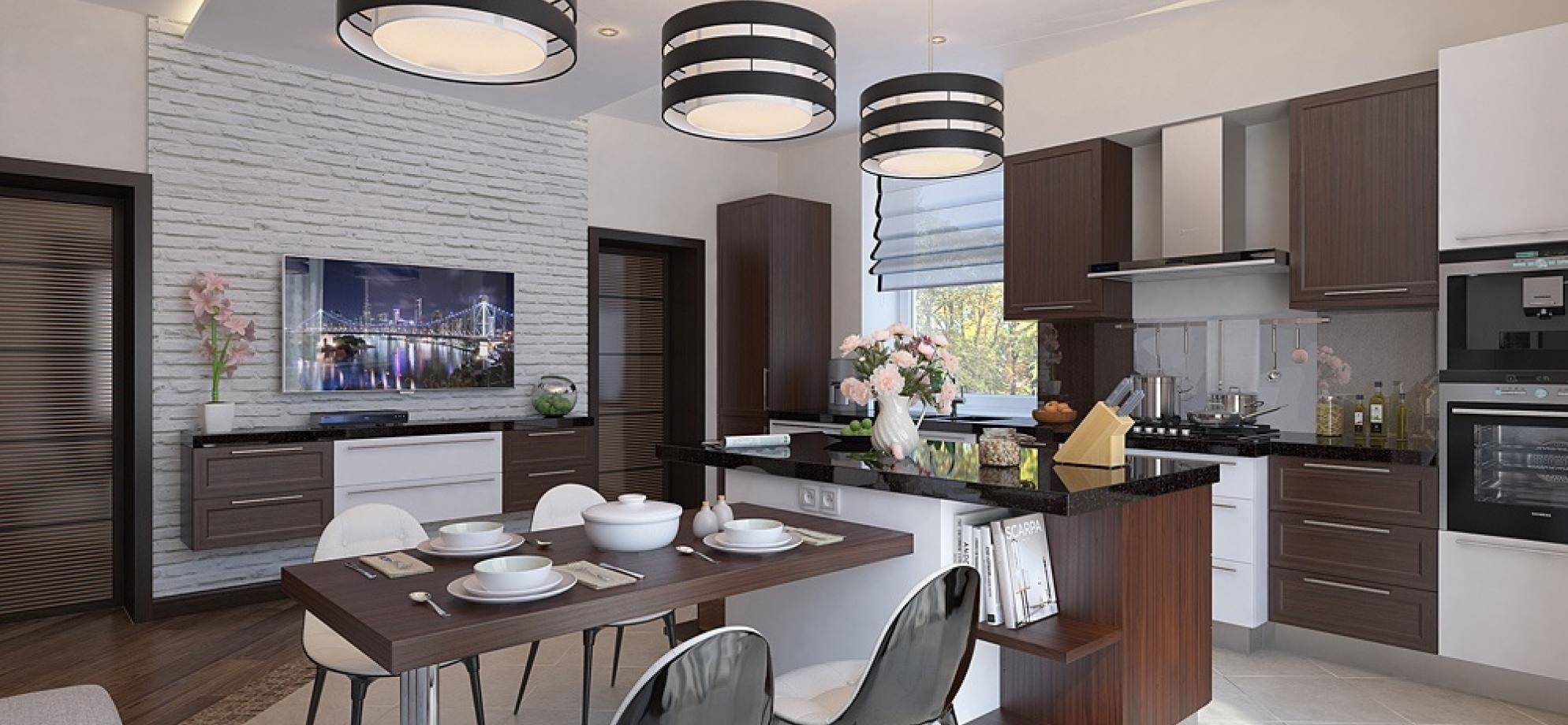 Один центральный светильник хорошо смотрится в обеденной зоне, где не нужен яркий свет. Если такой отдельной зоны нет, рекомендуем серию точечных светильников по периметру. Не помешает отдельная подсветка рабочей поверхности, которую можно встроить, например, в шкаф. А над барной стойкой красиво выглядит несколько небольших подвесных плафонов.