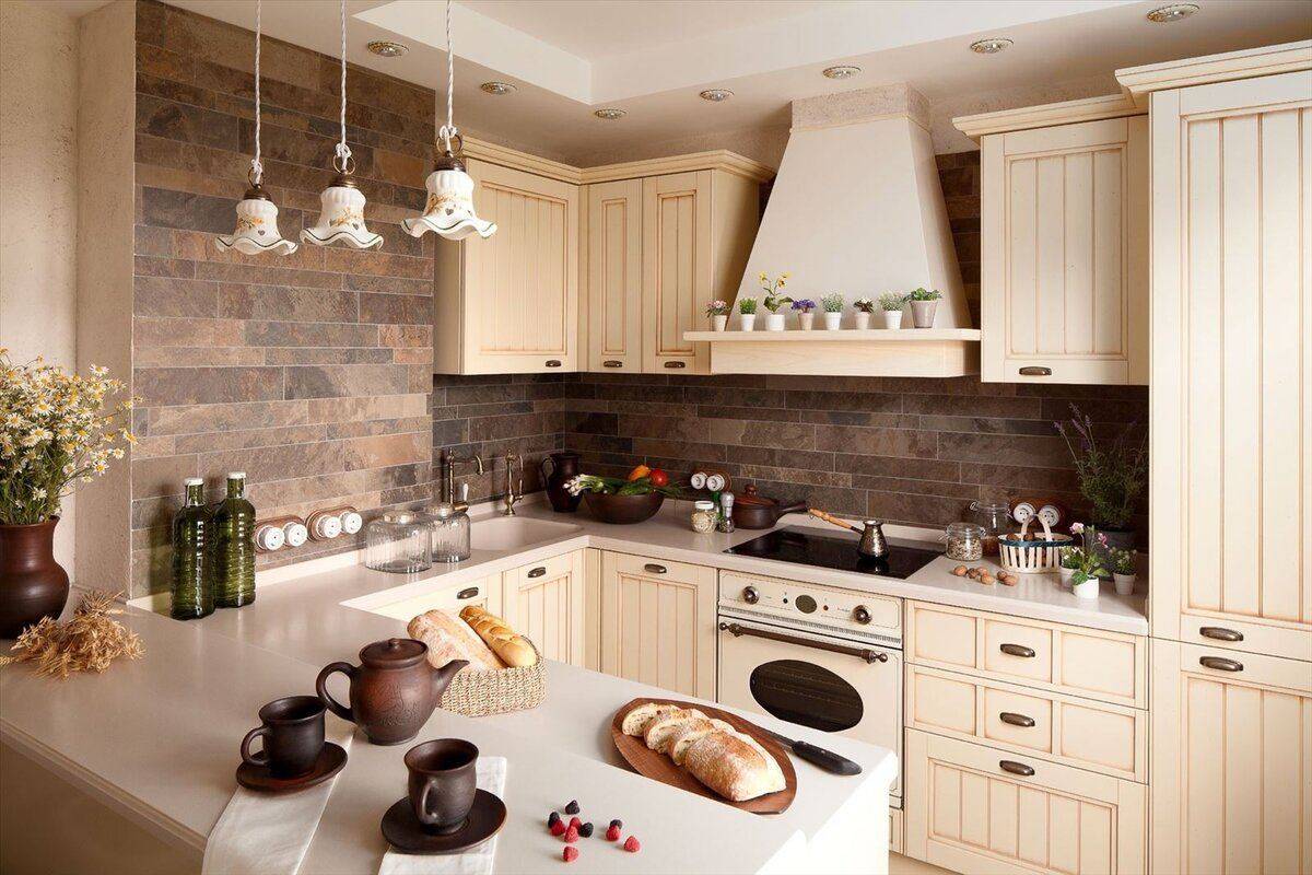 Фартук оформляется керамической плиткой, мозаикой, органично повторяющей мотивы гарнитура и тканей. Стены красятся, но в частном доме приемлема грубая побелка. Иногда поверхности стен выкладываются кирпичом или натуральным камнем.