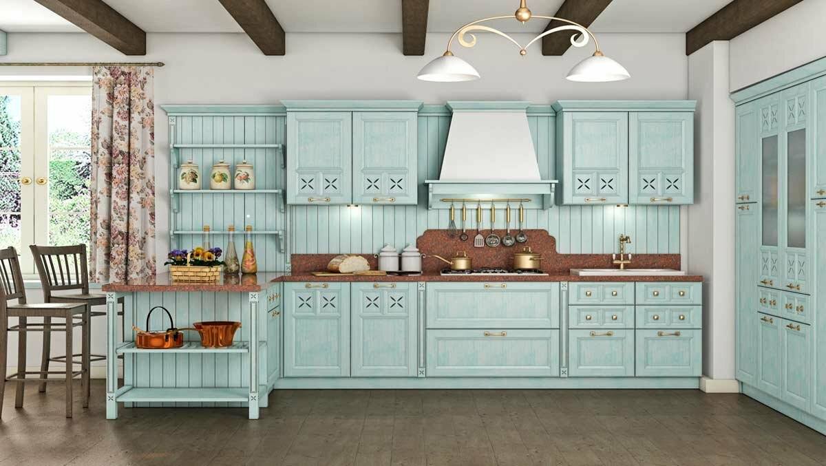 Сиреневый – традиционный цвет для этого стиля. Кухня, где преобладают оливковый или голубой, также впишется в деревенский стиль. Кухня в оттенках белого, к примеру, кремовая или айвори – распространенный вариант гарнитуров. Также деревенский стиль включает в свою колористическую гамму светло-серый и бледно-розовый цвета.