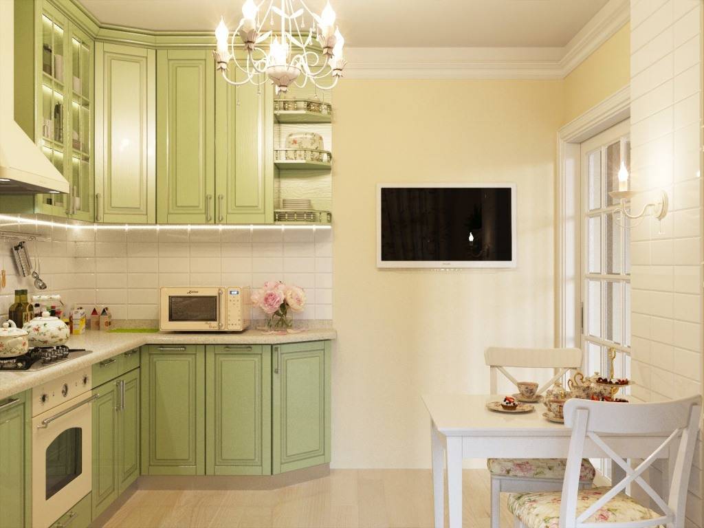 Этот стиль допускает наличие мягких желтых тонов. Такие цвета подойдут в том случае, если в кухне немного естественного освещения и ее площадь нельзя назвать большой.