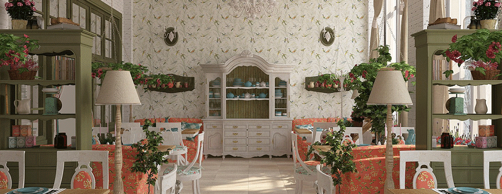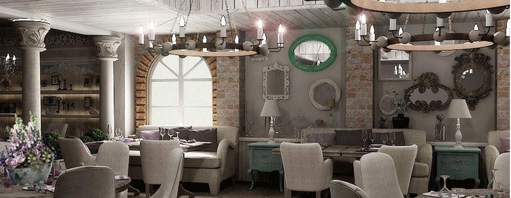 В качестве отделки дизайнеры часто прибегают к цветочным мотивам, интересным орнаментам. Стены украшаются текстильными панелями и шелкографией, если используются обои, то обязательно с имитацией цветочного узора, вытканного на полотне. Все это позволяет легко создать в заведении романтическую обстановку.