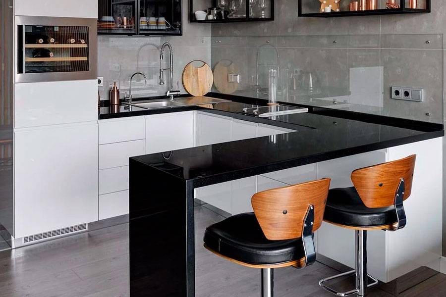 Барная стойка в этом случае будет выполнять две функции — рабочей и обеденной зоны. Компактное расположение мебели позволяет расположить все необходимое на минимальной площади.