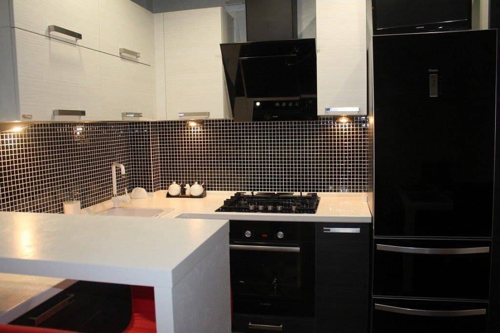 Кухня буквой П с использованием барной стойки вполне удачно справляется с разделением кухонной зоны и жилого пространства в квартирах-студиях. Даже, если совсем небольшое помещение — студия с таким столом будет максимально эргономичной и комфортной.