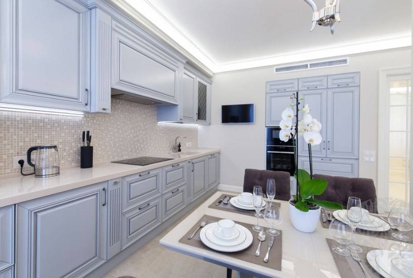 Такая кухня придется по душе практически всем. В данном стиле все сдержано, но не строго. Отлично впишется кухонный гарнитур из массива в светлом цвете с классической фурнитурой. Для освещения можно подобрать «хрустальную» люстру. Обеденная группа должна быть выполнена из тех же материалов, что и кухонных гарнитур. В качестве декора можно использовать вазу с цветами, фарфоровую посуду в серванте или шторы из легких материалов.