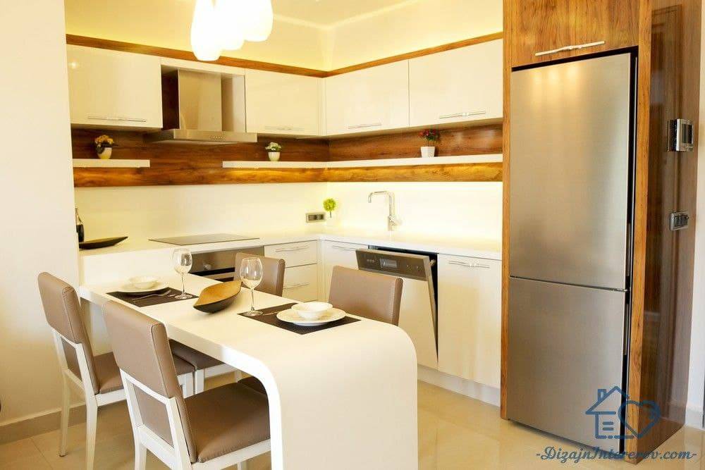 Конечно, это может быть интересный вариант, если расположить его у окна. Тогда гораздо приятнее находиться за стойкой. Но в маленькой кухне — это вполне грамотная экономия пространства. Тем более, что барная стойка на всю стену, не такая уж и широкая, в отличие от стандартного обеденного стола. К тому же она может стать дополнительной рабочей областью, например, если планируется приготовление пищи на какой-либо праздник.