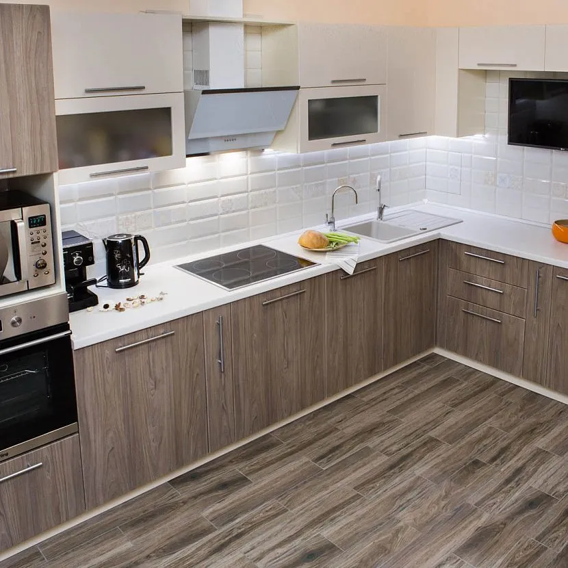 Не менее популярны модульные гарнитуры Леруа Мерлен. Среди новинок – фасады с имитацией натурального материала.