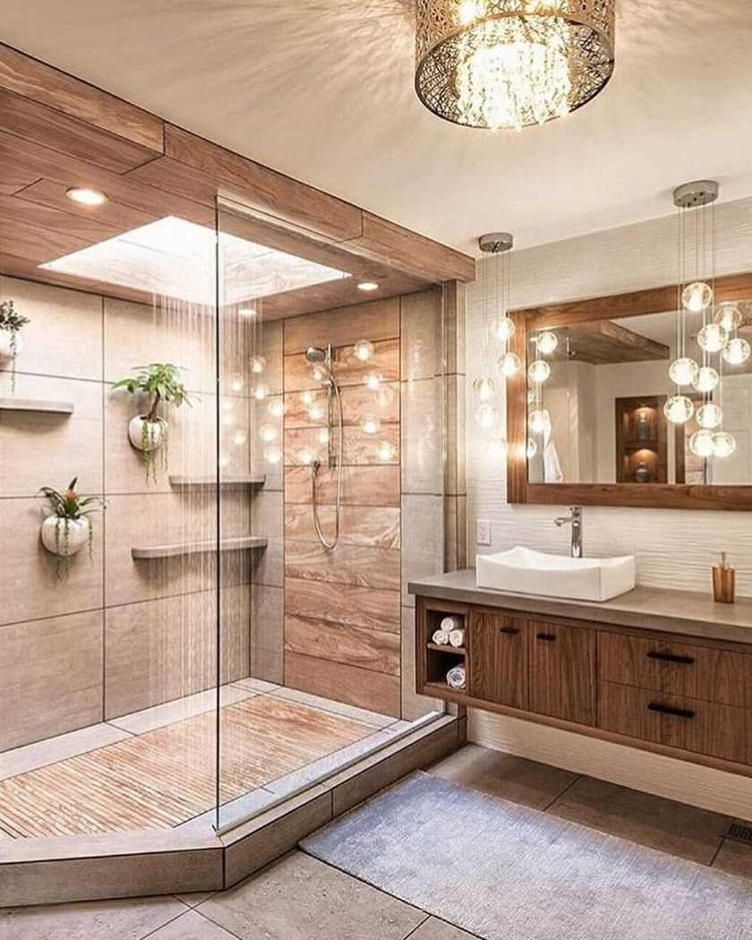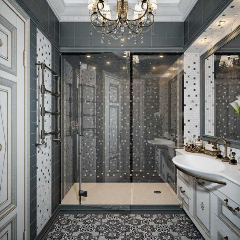 Планировка ванной комнаты с душевой зависит от размеров помещения. В больших комнатах стильно смотрится кабина с пятью стенами. В такой конструкции не только умещается душ, но и есть место для свободного передвижения.