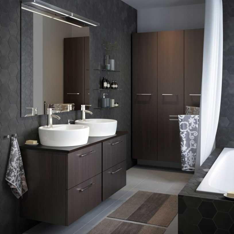 Никогда не ставьте предметы мебели впритык друг к другу и сантехнике. Это сделает ванную комнату громоздкой и может привести к появлению плесени из-за отсутствия воздушной прослойки между предметами.