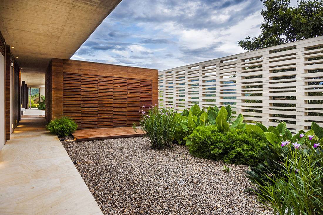 - архитектурное направление – это и строительство дома, и оформление участка. Здесь присутствуют чёткие линии, геометрические формы, всё построено на торжественности с современным минимализмом. Нельзя перебарщивать с элементами, дизайн построен на простоте и лаконичности.