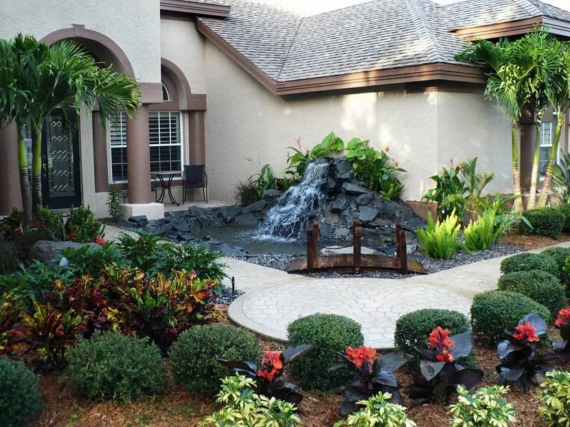 Искусственный пруд, сухой ручей, широкие ступени на крутых подъемах – все это интересные идеи для оформления участка перед домом.