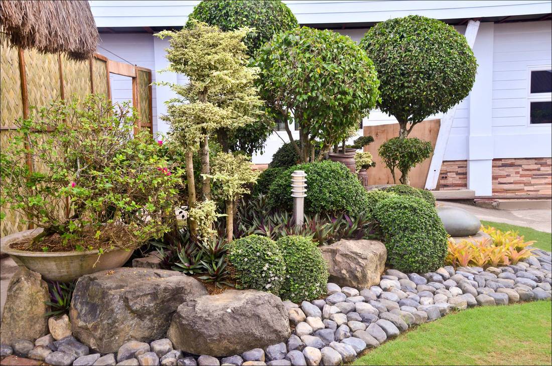 Хорошо будет смотреться композиция из камней, особенно на неровностях рельефа. Некоторые даже делают искусственные перепады участка, если он изначально плоский.