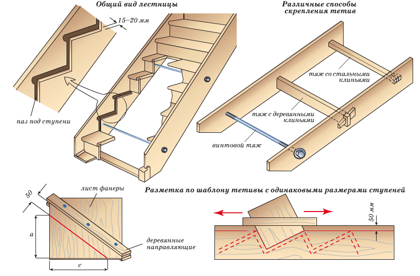 Конструкция с использованием треугольных кобылок является более надежной. Кобылки крепятся с использованием шкантов, для которых предварительно делаются пазы. Наиболее прочная конструкция получается с использованием кобылок сложной формы, при этом на косоурах делается специальный вырез. Соединение элементов лестницы осуществляется при помощи клея и саморезов.