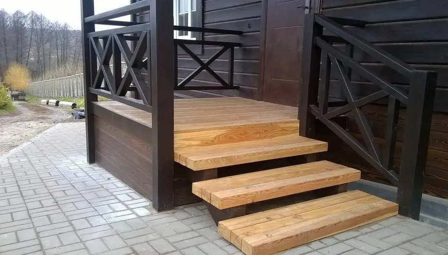 Лестница на веранду или террасу, монтируемая на тетивах, имеет одну особенность. Тетива изготавливается из толстой доски или бруса.