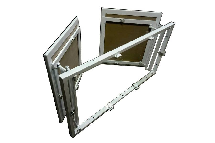 Если ширина проема превышает 70 см, можно выбрать однодверный люк с прочной рамой и мощным механизмом открывания, но лучше остановиться на двухдверной модели. Чаще всего такие люки оснащаются нажимными или распашными механизмами открывания.